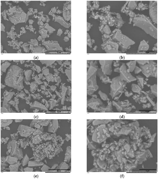 SEM of the teicoplanin-loaded BG45S5 formulations. F2l-BG45S5-T-T-0.5% (a,b), F2l-BG45S5-T-T-1% (c,d), and F2l-BG45S5-T-T-1.5% (e,f). Images were recorded at nominal magnifications of 1.5 k× (a,c,e) and 3 k× (b,d,f).