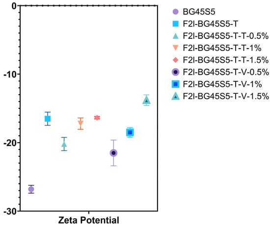 Mean ZPs are plotted in Figure 6 (n = 5). Uncoated BG45S5 carried a strongly negative charge (−26.8 ± 0.577 mV). Trehalose adsorption lifted the value to −16.5 ± 0.971 mV, and every drug-loaded sample showed an upward shift relative to the uncoated BG45S5.