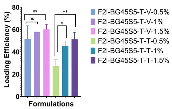 Loading efficiency of vancomycin-loaded (F2l-BG45S5-T-V) and teicoplanin-loaded (F2l-BG45S5-T-T) trehalose-primed Bioglass 45S5 at nominal doses of 0.5, 1.0, and 1.5 wt% (mean ± SD, n = 3). Vancomycin samples show no significant differences among doses (ns). Teicoplanin efficiency rises significantly from 0.5 wt% to 1.0 wt% (* p < 0.05) and further to 1.5 wt% (** p < 0.01); all teicoplanin values differ from their vancomycin counterparts at the same dose (not indicated for clarity; p < 0.05, Tukey post hoc test).