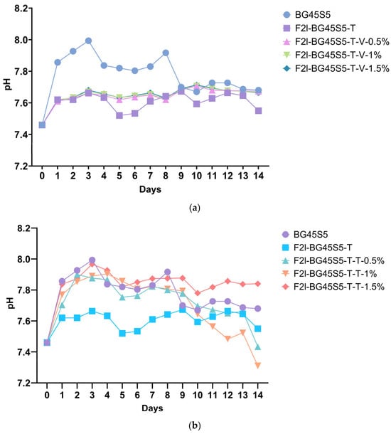 The daily pH profiles of the uncoated glass, the trehalose blank, and the drug-loaded formulations are shown in Figure 8a,b. The alkaline excursion exhibited by the uncoated glass (BG45S5) was significantly greater than that of every vancomycin-containing sample, whereas differences among the coated blank and the three vancomycin loads were not significant. For teicoplanin, only the coated blank differed significantly from BG45S5 as well as from the 1.5% formulation; the remaining comparisons were non-significant. These statistics confirm that trehalose priming is the main factor moderating the pH rise, while antibiotic identity and dose exert a secondary, formulation-specific influence.