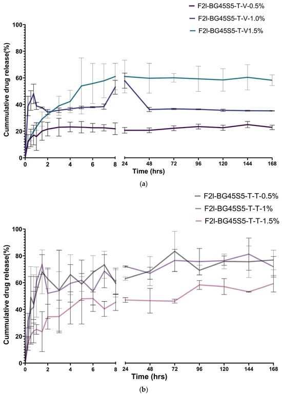 (a) Cumulative percentage drug release of BG45S5 formulations loaded with vancomycin HCl 0.5%, 1.0%, and 1.5% w/v over a period of 7 days. (b) Cumulative percentage drug release of BG45S5 formulations loaded with teicoplanin 0.5%, 1.0%, and 1.5% w/v over a period of 7 days.