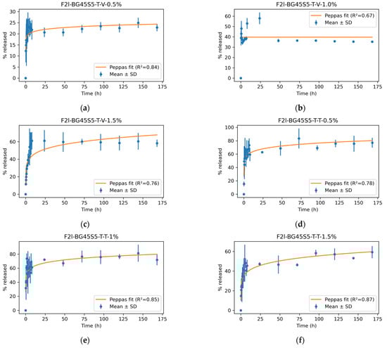 Mean release curves (n = 3) for teicoplanin (T-T) and vancomycin (T-V) are given in Figure 9a,b. All formulations displayed a biphasic pattern comprising (i) a burst phase during the first 2 h, followed by (ii) a slower, sustained phase that extended to 168 h. The kinetic models and the goodness of fit (R2) are represented in Figure 10.