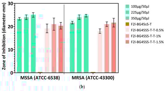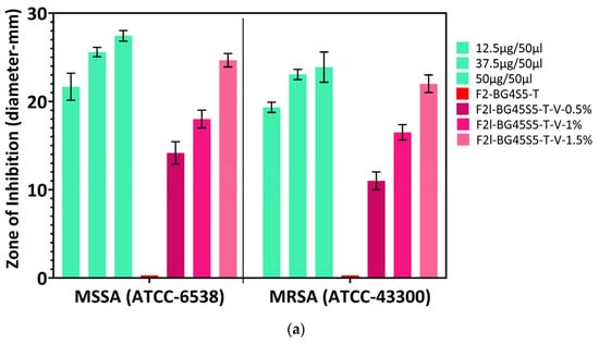 The antibacterial activity of the F2l-BG45S5-T formulations loaded with vancomycin and teicoplanin was screened with an agar-well diffusion assay on tryptone soy agar (TSA). Plates were lawn-seeded with 100 µL of a 0.5 McFarland suspension of either MSSA (ATCC 6538) or MRSA (ATCC 43300) and allowed to dry for 5–10 min. Using a sterile 8 mm pipette tip, equidistant wells were cut in the agar, and each was charged with 50 µL of the test formulation solution (n = 3) at the prescribed concentration. Inoculated plates were incubated at 37 °C for 24 h, after which the diameters of the clear zones of inhibition surrounding each well were measured with a transparent millimeter ruler.