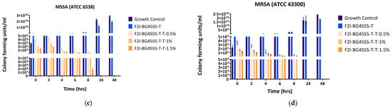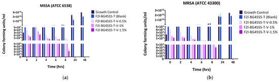 Time-kill kinetics of the vancomycin- and teicoplanin-loaded BG45S5 formulations were evaluated against MSSA (ATCC 6538) and MRSA (ATCC 43300). Overnight TSB cultures of each strain were diluted 1: 100 in fresh broth to give ~1 × 106 CFU mL−1, and 3 mL aliquots were dispensed into sterile tubes. Drug-loaded Bioglass particles were added directly to a final concentration of 5 mg mL−1 (no pre-dissolution) and the suspensions were incubated at 37 °C with orbital shaking (225 rpm). At 0, 2, 4, 6, 8, 24, and 48 h, 100 µL was removed and serially ten-fold-diluted in PBS, and viable counts were performed in triplicate by the Miles and Misra drop plate method on TSA. Plates were incubated overnight (37 °C) and drops yielding 30–300 colonies were enumerated; results were expressed as CFU mL−1. All assays were run in triplicate with untreated cultures as growth controls.