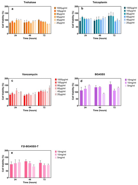 Vancomycin HCl, teicoplanin, and trehalose dihydrate were freshly prepared in DMEM at 1000, 100, 80, 60, 40, and 20 µg mL−1 and tested under the same incubation periods.