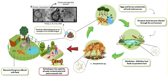 - Araújo, J.V.; Fonseca, J.S.; Barbosa, B.B.; Valverde, H.A.; Santos, H.A.; Braga, F.R. The role of helminthophagous fungi in the biological control of human and zoonotic intestinal helminths. Pathogens 2024, 13, 741. [Google Scholar] [CrossRef]