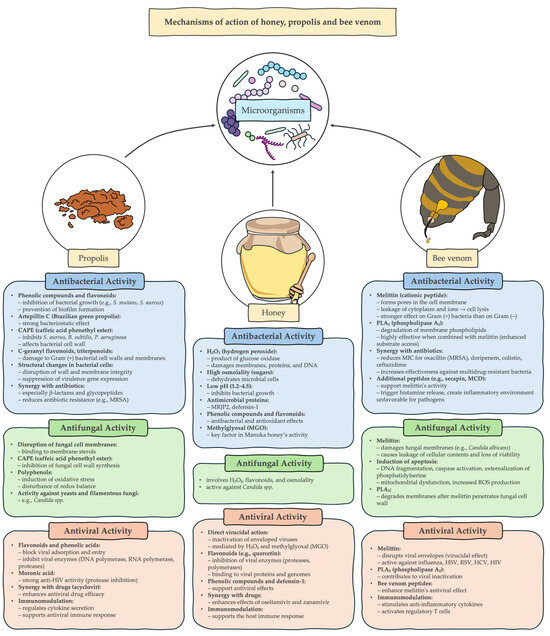 Bees, in addition to their key role in pollinating plants, are also valued for providing products with high therapeutic potential. Of particular importance among them are honeybees, such as Apis mellifera (found mainly in Europe, America, Africa and Asia) and Apis cerana (from Southeast Asia), which produce a wide range of bee products rich in bioactive compounds, including polyphenols, flavonoids, proteins, organic acids and enzymes. The most important of these include honey, bee pollen, bee bread, royal jelly, propolis and bee venom, valued for centuries for their potential health-promoting properties [8,9,10,11,12,13,14]. In the traditions of many cultures, these products have held an important place in phytotherapy for centuries, which is confirmed by historical references to their use in healing wounds, treating skin diseases and digestive system diseases [15,16]. An example would be the use of honey in ancient Egypt to disinfect wounds or propolis in ancient Greece as an antiseptic substance [17,18]. Nowadays, thanks to the development of biological and medical sciences, we are increasingly understanding the mechanisms of action of these natural products, and numerous studies indicate their antimicrobial, anti-inflammatory, immunomodulatory and antioxidant properties [3,5,19,20,21].
