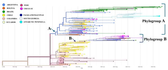 Phylogroup A expanded from Argentina to Bolivia and Uruguay, later reaching Brazil and eventually re-entering Uruguay. This phylogroup also dispersed southward from Argentina to Antarctic regions, including South Georgia Island and the Antarctic Peninsula. These transmission routes were primarily mediated by migratory birds, although pinnipeds were occasionally affected during the later stages of the epidemic.