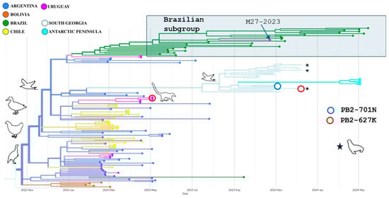 Phylogroup A, which includes sixteen Uruguayan samples (Table 1), such as the recently obtained M27-2023 from a royal tern, clusters with strains from Argentina, Bolivia, Brazil, Chile, South Georgia Island, and the Antarctic Peninsula (Figure 2 and Figure S1). It most likely originated in Argentina, with a 99% probability, in October 2022, with poultry serving as the ancestral hosts (100% probability). Most South American strains are from birds, except for three strains from Uruguayan coatis. The other non-avian hosts were pinnipeds from South Georgia Island (Antarctic region). The M27-2023 strain belongs to a Brazilian subgroup (originating in January 2023) of wild birds, with two basal sequences from backyard poultry in Uruguay (Figure 2). This clade maintains typical avian amino acid profiles, apart from the 627K mutation found in two coatis and a South Georgia Island pinniped and the 701N residue observed in a South Georgia Island wild bird (Figure 2). The 627K and the 701N amino acids in coatis, pinnipeds, and the wild bird occurred in different branches of phylogroup A.