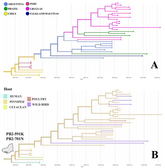 Phylogroup B originated in Chile and spread along the Pacific coast to Patagonia and the Atlantic coast, reaching Argentina, Uruguay, and Brazil (Figure 3 and Figure 4). Most strains have been found in sea lions (Otaria flavescens) and other marine mammals, highlighting their role as key hosts in the transmission dynamics of this group. Unlike phylogroup A, which mainly includes strains from birds, phylogroup B emerged in marine mammals and shows adaptive mutations, indicating ongoing adaptation to non-avian hosts. All phylogroup B strains share two mammalian-adaptive substitutions in PB2 (Q591K, D701N). This unusual combination of mammalian adaptations in PB2 has been previously observed in South American pinnipeds [19,22,32,43] and likely represents a set of co-adapted changes. Two ancestral strains from pinnipeds, which are phylogenetically basal but not part of phylogroup B, only carry the 701N residue, suggesting that this substitution appeared before the emergence of 591K. These findings support a stepwise evolutionary pathway leading to the co-occurrence of both amino acid substitutions.