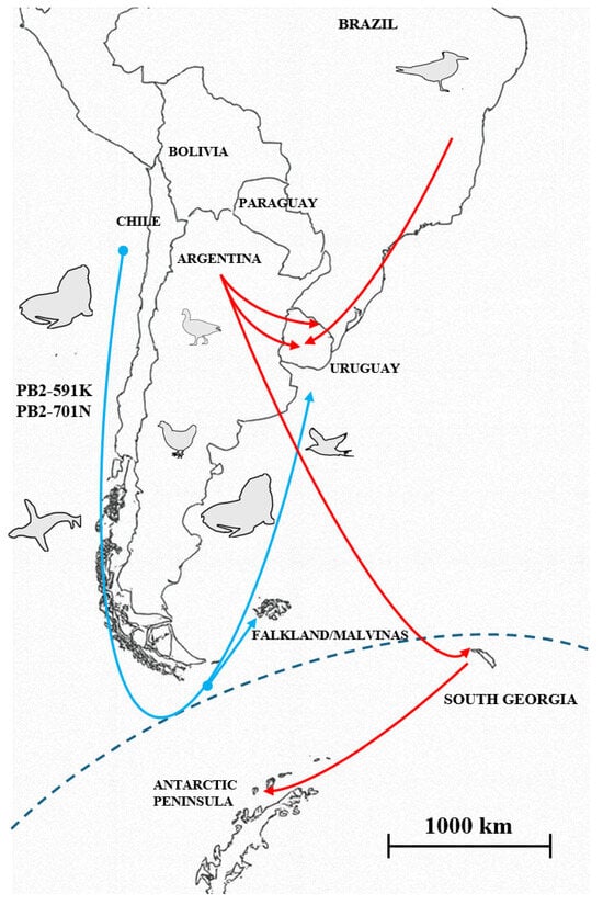 The convergence of migration routes in Uruguay. Uruguayan strains (phylogroup A, red lines) mainly originated from birds, arriving in February and May 2023 from Argentina. Additionally, a secondary entry was recorded from Brazil in August 2023. Phylogroup A strains also reached South Georgia Island and subsequently the Antarctic Peninsula. Phylogroup B strains (blue line), primarily originating from and mainly transmitted by pinnipeds, reached Uruguay in August 2023; these strains also entered the Falkland/Malvinas Islands (sub-Antarctic region).
