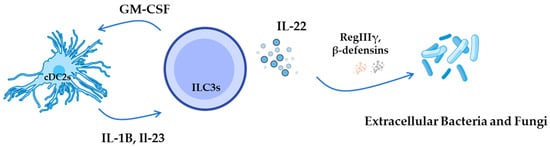 Group 3 ILCs include natural cytotoxicity receptor (NCR)−ILC3s, NCR+ ILC3s, and LTi cells, all of which rely on the transcription factor RORγτ for their function and can secrete IL-17, IL-22, or both simultaneously [28]. They play a role in combating bacterial infections by secreting IL-22, which prompts epithelial cells to produce antimicrobial peptides [36].