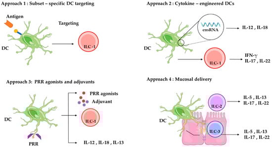 While DCs have been widely studied as antigen-presenting cells in vaccine design, their role in directly modulating ILCs remains largely unexplored. Most existing DC-based vaccines have been designed to stimulate adaptive immune responses, particularly cytotoxic T cells, with limited consideration of early innate effectors like ILCs. This represents critical oversight, especially given the tissue-localized, rapid-response functions of ILCs during infection. Integrating ILC-directed modulation into DC vaccine strategies introduces approaches to enhance mucosal immunity and tissue-specific protection, outcomes where traditional vaccine platforms often fall short.