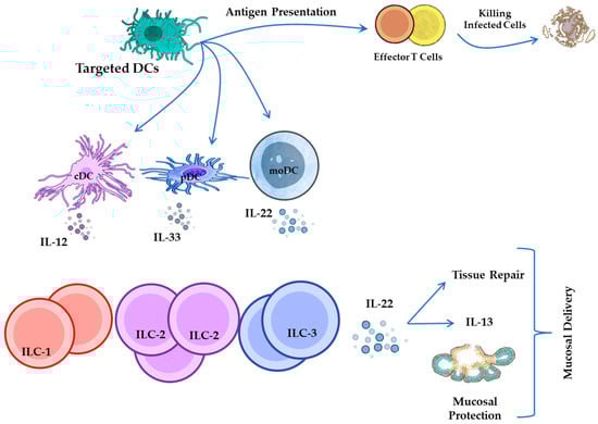 ILCs contribute to mucosal immunity and antibacterial defense at barrier sites [71]. While their roles in responding to pathogens, such as Mycobacterium tuberculosis, Listeria monocytogenes, Salmonella typhimurium, and Helicobacter pylori are well-documented, the modulation of ILC activity by DCs remains a critical area of investigation.