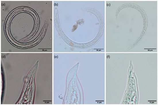 Morphology of metastrongyloid lungworm larvae. (a) Crenosoma sp. L3; (b) Angiostrongylus vasorum L3; (c) Angiostrongylus vasorum L1; (d) Crenosoma sp. L3 tail; (e) Angiostrongylus vasorum L3 tail; (f) Angiostrongylus vasorum L1 tail.