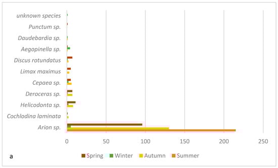 Gastropod collection was performed once in all four seasons (spring, summer, autumn, and winter). Please refer to Supplementary Figure S1 for details about sampling conditions. A total number of 533 gastropods (i.e., snails, slugs) including 11 different gastropod species were collected on the hotspot meadow in 2022 and 2023. Representative images of some identified species are shown in Supplementary Figure S2. Since gastropod activity spikes in the early morning hours, the sampling was performed around sunrise. Depending on the weather conditions, gastropod collection required between 1 and 4 h.