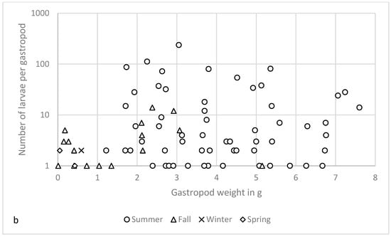 The larval burden was highest in summer, with one slug carrying a mean of 77.07 larvae per g bodyweight (BW). The lowest burden was observed in summer as well, with 0.15 larvae per g BW. There was no clear correlation between gastropod BW and larval burden (Figure 2). Most gastropods (56/77) harbored a relatively low larval burden with less than 10 larvae per individual. Very high numbers of larvae (more than 100) were discovered only in two gastropods.