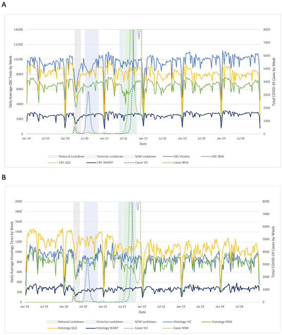(A) Daily average CBC tests by week, versus lockdown periods and COVID-19 case numbers, by state/territory; (B) Daily average histology tests by week, versus lockdown periods and COVID-19 case numbers, by state/territory. Case numbers were not included after the start of May 2022 due to sustained high cases numbers which could not be appropriately graphed.