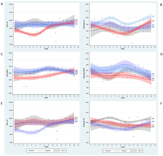Observed values and cubic splines estimated (95% CI) daily average test counts by week in the acute pandemic phase for: (A) CBC during the second Vic lockdown in 2020 (red), compared to the corresponding calendar periods in 2019, 2021 and 2022; (B) histology counts by week during the second Vic lockdown in 2020 (red), compared to the corresponding calendar periods in 2019, 2021 and 2022; (C) CBC counts by week during the second NSW lockdown in 2021 (red), compared to the corresponding calendar periods in 2019, 2020 and 2022; (D) histology counts by week during the second NSW lockdown in 2021 (red), compared to the corresponding calendar periods in 2019, 2020 and 2022; (E) CBC counts by week during the fifth and sixth Vic lockdown in 2021 (red), compared to the corresponding calendar periods in 2019, 2020 and 2022; (F) histology counts by week during the fifth and sixth Vic lockdown in 2021 (red), compared to the corresponding calendar periods in 2019, 2020 and 2022.