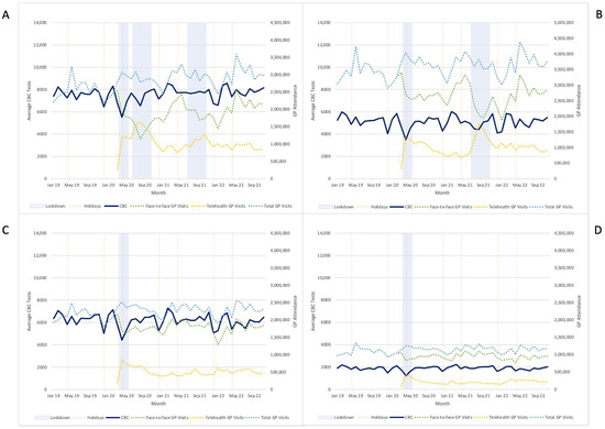 Daily average CBC tests by month versus face-to-face, telehealth, and total GP attendances by state/territory (A) Vic; (B) NSW; (C) QLD; (D) WA/NT.