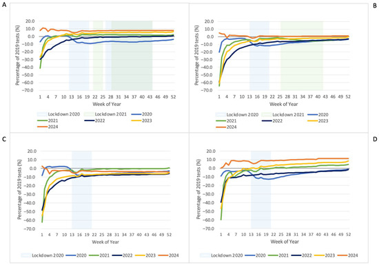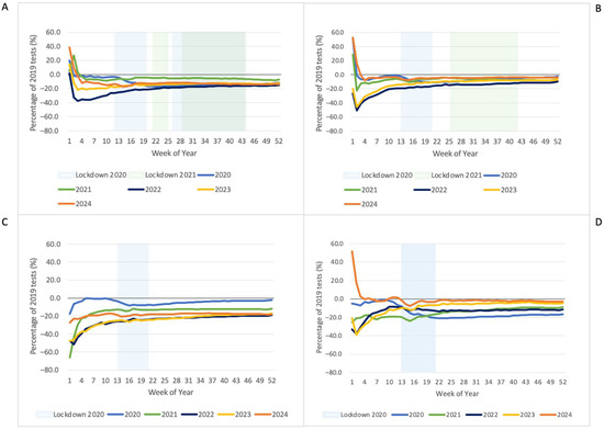 Percentage difference of cumulative CBC tests relative to 2019 by year and state/territory: (A) Vic; (B) NSW; (C) QLD; (D) WA/NT.