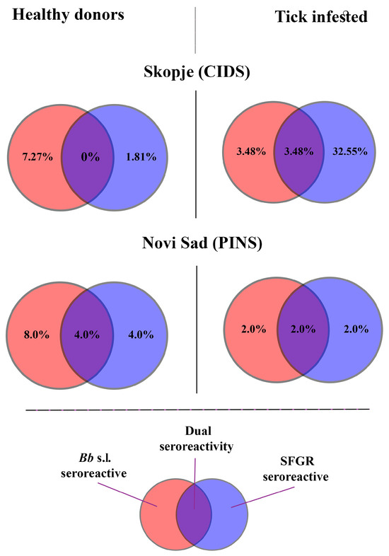Across the two study regions, co-exposure to both pathogens was observed in all cohorts except in healthy donors from Skopje (3/4; 75%) (Figure 2). Among tick-infested individuals, dual exposure was most commonly observed in Skopje (3.48%). Surprisingly, the rate of dual exposure was highest in healthy donors from Novi Sad (4.0%) (Figure 2).