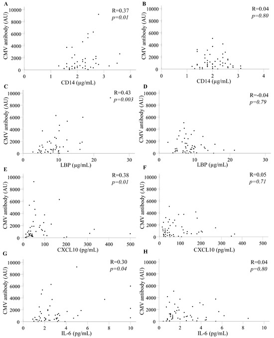 Levels of CMV-reactive antibodies correlate with inflammatory markers 12 months before a diagnosis of CAD. Scatterplots and spearman’s rank coefficients (R) are shown. Levels of CMV-reactive antibody are expressed in arbitrary units (AU). (A) sCD14 in PLWH who developed CAD and (B) sCD14 in PLWH who did not develop CAD. (C) LBP in PLWH who developed CAD and (D) LBP in PLWH who did not develop CAD. (E) CXCL10 in PLWH who developed CAD and (F) CXCL10 in PLWH who did not develop CAD. (G) IL-6 in PLWH who developed CAD and (H) IL-6 in PLWH who did not develop CAD.