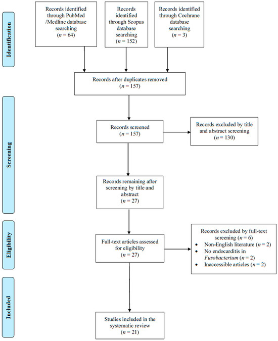A total of 157 non-duplicate articles from PubMed, Cochrane Library, and Scopus were evaluated through the initial screening process. After reviewing the titles and abstracts, 27 articles were selected for review of the full text. From these studies, 6 were excluded from the review: 2 articles could not be found, 2 were not in English, and 2 were not associated with Fusobacterium infective endocarditis. No study was included after a search of the references of the previously mentioned studies. Finally, 21 met the inclusion criteria of the present study [18,19,20,21,22,23,24,25,26,27,28,29,30,31,32,33,34,35,36,37,38]. Figure 1 shows a graphical representation of the study inclusion procedure.