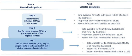 - Verhofstede, C.; Fransen, K.; Van Den Heuvel, A.; Van Laethem, K.; Ruelle, J.; Vancutsem, E.; Stoffels, K.; Van den Wijngaert, S.; Delforge, M.-L.; Vaira, D.; et al. Decision tree for accurate infection timing in individuals newly diagnosed with HIV-1 infection. BMC Inf. Dis. 2017, 17, 738. [Google Scholar] [CrossRef]