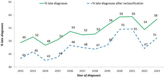 - Kirwan, P.D.; Croxford, S.; Aghaizu, A.; Murphy, G.; Tosswill, J.; Brown, A.E.; Delpech, V.C. Re-assessing the late HIV diagnosis surveillance definition in the era of increased and frequent testing. HIV Med. 2022, 23, 1127–1142. [Google Scholar] [CrossRef]