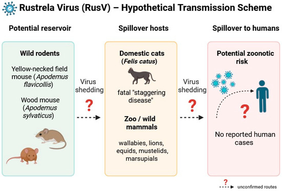 Schematic representation of the hypothetical transmission pathways of rustrela virus (RusV). Wild rodents—particularly the yellow-necked field mouse (Apodemus flavicollis) and the wood mouse (Apodemus sylvaticus)—are proposed as potential reservoir hosts. The exact mechanisms of virus shedding and interspecies transmission remain undetermined. Spillover infections have been documented in domestic cats (Felis catus) and various zoo or wild animals, including donkeys (Equus asinus), capybaras (Hydrochoerus hydrochaeris), red-necked wallabies (Macropus rufogriseus), lions (Panthera leo), and otters (Lutra lutra), leading to fatal nonsuppurative meningoencephalomyelitis. Although no human infections have been reported to date, the virus’s neurotropism, broad host range, and phylogenetic relationship to the rubella virus raise concerns regarding its zoonotic potential.