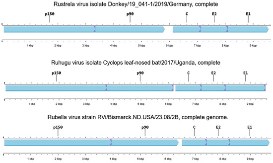 Comparative genome structure of rustrella virus (NC_076451.1), ruhugu virus (NC_076450.1), and rubella virus (NC_076948.1). The genome has two ORFs consisting of two non-structural polyproteins (nsPP), namely p90 and p150 proteins, and three structural proteins (sPP), including the C capsid protein and the two envelope glycoproteins E2 and E1 [29].