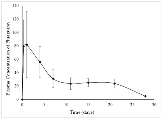 Mean ± SD of plasma concentration of fluazuron (ng·mL−1) in guinea pigs treated orally with a single dose of a bait containing fluazuron (10 mg/kg).