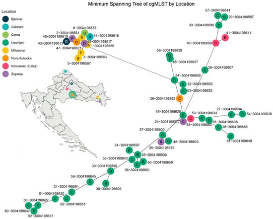 Minimum spanning tree (MST) of Leptospira kirschneri isolates based on core genome multilocus sequence typing (cgMLST). The MST was constructed from allele profiles of 48 isolates collected from rodents across eight locations in Croatia. Each node represents a single isolate and is color-coded by sampling location. Genotype clusters (A–G) are labeled within the nodes and were defined based on allelic similarity and MST topology. Edges represent the smallest number of allelic mismatches between profiles. Genotype C (cgST-1017) occupies the central portion of the network. Genotype B includes cgSTs 1012, 1016, and 1017; Genotype D includes cgSTs 1016 and 1017; Genotype E corresponds to cgST-1012; Genotype F includes cgSTs 959 and 1017; and Genotype G includes cgSTs 1011, 1013, and 1849.