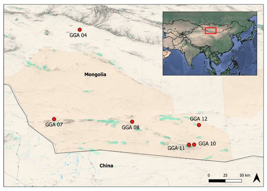 The University of Florence (UniFI), in collaboration with the National University of Mongolia, the University of Verona, the Italian Institute for Environmental Protection and Research (ISPRA), and the Istituto Zooprofilattico Sperimentale della Lombardia e dell’Emilia Romagna (IZSLER), organized a 25-day expedition in the Gobi Desert. Multidisciplinary scientists explored six oases (Figure 1) as follows: