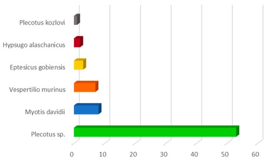 Morphological identification revealed that the most representative genus found in the Gobi Desert was Plecotus, followed by individuals of the Hypsugo, Vespertilio, and Myotis species. Subsequent molecular analysis of patagium portions facilitated a more precise identification of the various bat species, confirming a notable presence (73%) of bats belonging to Plecotus spp. with 54 individuals, including one Plecotus kozlovi. These were followed by eight Myotis davidii (10.8%), seven Vespertilio murinus (9.5%), three Eptesicus gobiensis (4%), and two Hypsugo alaschanicus (2.7%) (Figure 2).