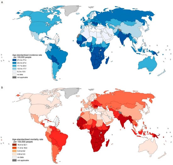 - Singh, D.; Vignat, J.; Lorenzoni, V.; Eslahi, M.; Ginsburg, O.; Lauby-Secretan, B.; Arbyn, M.; Basu, P.; Bray, F.; Vaccarella, S. Global estimates of incidence and mortality of cervical cancer in 2020: A baseline analysis of the WHO Global Cervical Cancer Elimination Initiative. Lancet Glob. Health 2023, 11, e197–e206. [Google Scholar] [CrossRef]