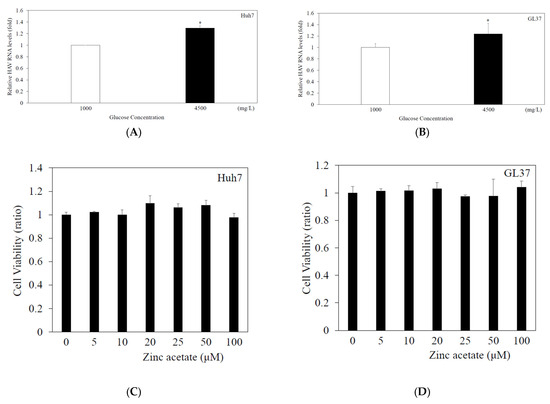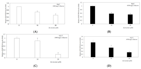 Zinc acetate inhibits HAV HA11-1299 genotype IIIA RNA replication in both Huh7 cells (A,B) and GL37 cells (C,D). Cells were cultured in low-glucose Dulbecco’s modified Eagle’s medium (DMEM) (A,C); or high-glucose DMEM (B,D). HAV RNA was measured by real-time RT-PCR after 48 h of infection. Zinc acetate was used at the indicated concentrations for 24 h. * p < 0.05 indicates a statistically significant difference, compared with those without zinc acetate treatment according to Student’s t test.