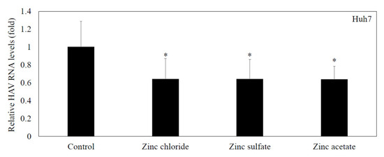 Zinc compounds significantly inhibited HAV HA11-1299 genotype IIIA replication in Huh7 cells. Zinc compounds (zinc chloride, zinc sulfate and zinc acetate) significantly inhibited HAV RNA replication in Huh7 cells compared with cells without treatment. HAV RNA was measured by real-time RT-PCR after 48 h of infection. Zinc compounds were used at 20 μM. * p < 0.05 indicates a statistically significant difference, compared with cells without treatment according to Student’s t test.