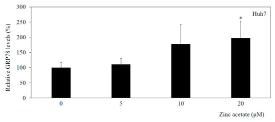 To examine the effects of zinc acetate on cell proliferation (Figure 1C,D), Huh7 and GL37 cells were incubated with different concentrations of zinc acetate (5, 10, 20, 25, 50 and 100 μM) for 48 h, and cell viability was evaluated via the MTS assay. Cellular viabilities were not reduced when Huh7 or GL37 cells were incubated with zinc acetate. We selected concentrations of zinc acetate 10–20 µM for further studies.