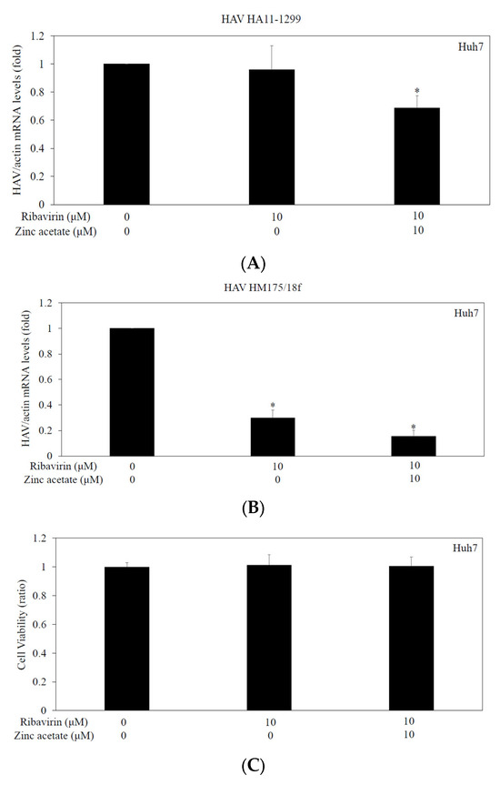 Suppression of both the HAV HA11-1299 genotype IIIA and HAV HM175/18f genotype IB replication by the combination of ribavirin and zinc acetate was greater than that of ribavirin alone or the untreated control (Figure 5A,B). No effects of the combination of ribavirin and zinc acetate on the cell viability of Huh7 cells were observed (Figure 5C).