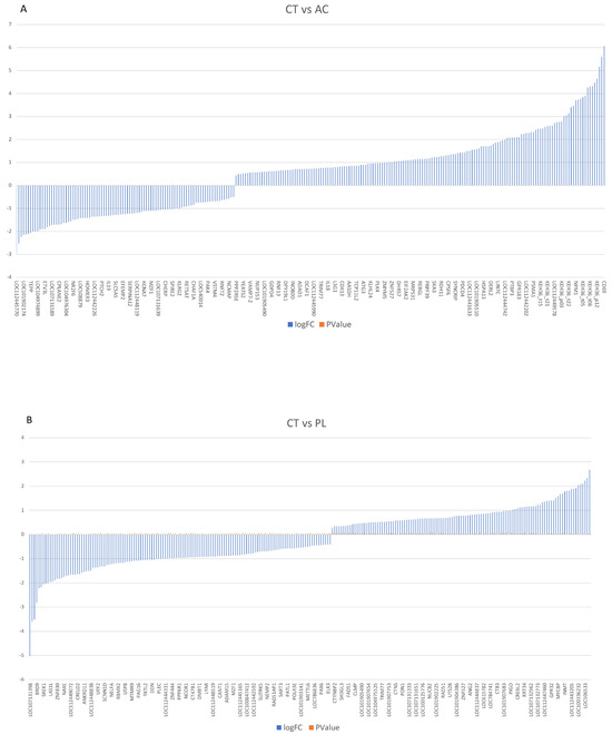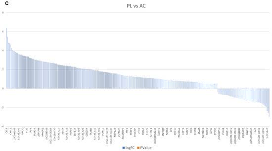 The study revealed significant disparities in the genetic blueprints of blood cells infected with BLV compared to those not infected, as well as between lymphocytosis and asymptomatic carriers. In total, 22,797 reads were detected, with 12,415 reads showing increased activity and 10,382 exhibiting decreased activity in AC versus CT ones. To visualize differential gene expression across the stages of BLV infection, volcano plots were generated for three pairwise comparisons: healthy control vs. asymptomatic carriers, healthy control vs. PL, and persistent lymphocytosis vs. asymptomatic carriers (Appendix A, Appendix B and Appendix C). Each plot displays the log2 fold-change (x-axis) against the −log10-adjusted p-value (y-axis), allowing for simultaneous assessment of both statistical significance and the magnitude of expression changes. Genes positioned in the upper right and upper left quadrants represent significantly upregulated and downregulated transcripts, respectively (Appendix A, Appendix B and Appendix C).