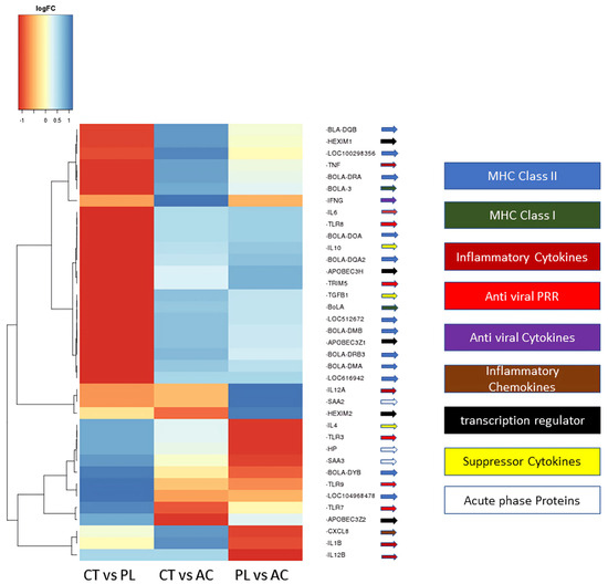The directional gene expression heatmap analysis of the three study groups. These results demonstrated that gene expression clusters varied in the study groups. CT: BLV-negative healthy group; PL: persistence lymphocytosis; AC: asymptomatic carrier. PRR: pattern recognition receptor. MHC: major histocompatibility complex. Log FC: Logarithm fold change.
