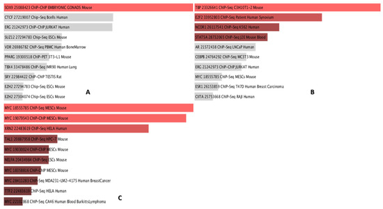 An analysis of gene ontology enrichment revealed that a significant upregulation in the PBLs of asymptomatic carriers is explicitly associated with the SRY-Box transcription factor 9 (SOX9) transcription factor, which plays a role in B-cell development, particularly in terminal differentiation to plasma cells [19,20] (Figure 3A). In comparing the negative control group and persistent lymphocytosis, the TATA-box binding protein, E2F transcription factor 2, nuclear receptor corepressor 1, and signal transducer and activator of transcription 5A are the most upregulated transcription factors (Figure 3B). Furthermore, a CHeA transcription analysis identified that MYC, 5′-3′ exoribonuclease 2 (XRN2), or a Dhm1-like protein and TAL BHLH transcription factor 1 (TAL 1) are upregulated in PL compared to asymptomatic carriers (Figure 3C).