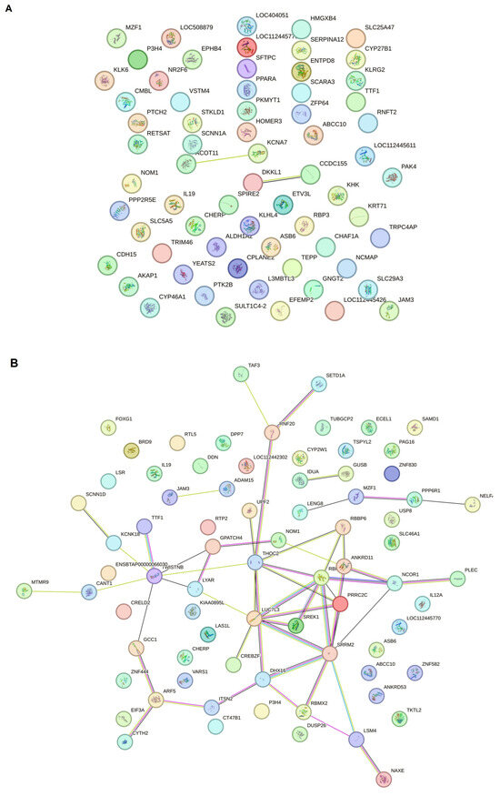 In our study, PPINs in three groups were examined and compared. The upregulated genes from each group’s compression were obtained from the DEA file and inserted into the STRING program. For gene selection, a Log FC ≥ 2 was considered the cutoff point; therefore, approximately the top 250 genes are available for creating the network (Figure 4A–C).