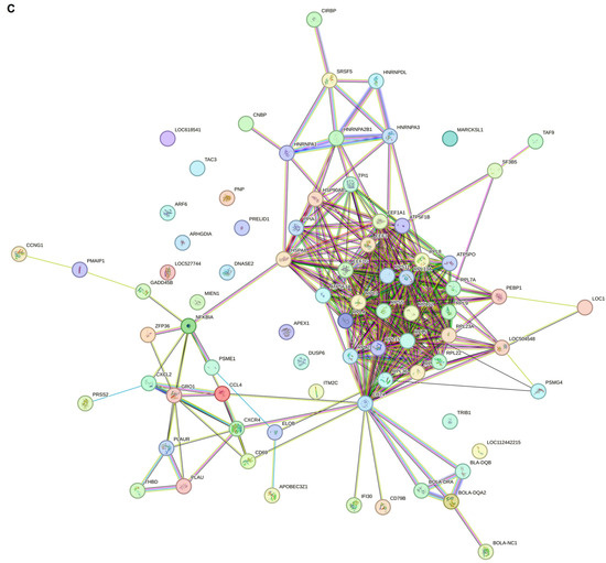 This study further investigated the PPINs to understand the relationships between DEGs and disease progression in BLV infection. The comparison between CT and AC (Figure 4A) revealed a significant difference in DEGs. However, the resulting PPIN did not exhibit extensive new connections or pathways, suggesting a limited level of interaction amongst the upregulated genes at this early stage of infection. In contrast, the PPIN analysis comparing CT and PL groups (Figure 4B) demonstrated a more complex network with increased connections, suggesting more extensive protein interactions and a possible link to oncogenesis. This expansion of the interaction network was further amplified in the comparison between PL and AC groups (Figure 4C), revealing a substantial increase in protein interactions and the development of a network indicative of progression to a malignant stage, contrasting sharply with the latency period represented by the AC group. Our results demonstrated that the malignant stage occurs when PPINs form new connections to activate steady-state cells and transform them into cells with abnormal proliferation in BLV infection.