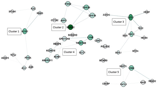 Protein–protein interaction network and cluster analysis of differentially expressed genes. This figure represents a protein–protein interaction (PPI) network constructed from differentially expressed genes grouped into five distinct clusters based on their functional associations. Each node represents a protein, and edges denote predicted or experimentally validated interactions. The intensity of the green color in the nodes corresponds to the degree of connectivity, with darker shades indicating higher interaction scores. Cluster 1 includes NCOR1 (nuclear receptor corepressor 1), PPARA (peroxisome proliferator-activated receptor alpha), PLEC (plectin), RBM25 (RNA binding motif protein 25), SRTAN1 (sirtuin and ankyrin repeat domain containing 1), ACLY (ATP citrate lyase), JAM3 (junctional adhesion molecule 3), TKTL2 (transketolase-like 2), and ADAM15 (ADAM metallopeptidase domain 15). Cluster 2 consists of SRRM2 (serine and arginine repetitive matrix 2), ARF5 (ADP ribosylation factor 5), ITSN2 (intersectin 2), DHX16 (DEAH-box helicase 16), DHX30 (DEAH-box helicase 30), and CYTH2 (cytohesin 2). Cluster 3 includes LUC7L3 (LUC7 like 3 pre-mRNA splicing factor), PRRC2C (Proline-rich coiled-coil 2C), THOC2 (THO complex subunit 2), CREBZF (CREB/ATF bZIP transcription factor), SREK1 (serine/arginine-rich splicing factor 1), ZCCHC14 (zinc finger CCHC-type containing 14), HMGXB4 (high mobility group box family member B4), BOD1L1 (biorientation of chromosomes in cell division 1-like 1), and SETD1A (SET domain containing 1A). Cluster 4 contains LYAR (ly1 antibody reactive), TWISTNB (TWIST neighbor), NOM1 (nucleolar protein with MIF4G domain 1), ANKRD11 (ankyrin repeat domain 11), KCNK18 (potassium two pore domain channel subfamily K member 18), GPATCH4 (G patch domain containing 4), RBBP6 (retinoblastoma binding protein 6), SCNN1D (sodium channel epithelial 1 subunit delta), GCC1 (GRIP and coiled-coil domain containing 1), CANT1 (calcium activated nucleotidase 1), and POLR3E (RNA polymerase III subunit E). Finally, cluster 5 includes SAMD4A (SM4) (sterile alpha motif domain containing 4A), SART3 (squamous cell carcinoma antigen recognized by T cells 3), PATL1 (protein associated with topoisomerase II homolog 1), NAXE (NAD(P)HX epimerase), RBMX2 (RNA binding motif protein X-linked 2), and CHERP (Calcium homeostasis endoplasmic reticulum protein).