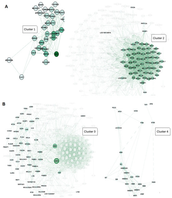 Protein–protein interaction network and cluster analysis of differentially expressed genes. A and 6 show the protein–protein interaction (PPI) networks for two major clusters of genes based on functional grouping and connectivity. Each node represents a protein, while edges denote predicted or experimentally validated interactions. The intensity of the green color of the nodes indicates the degree of connectivity, with darker green nodes representing highly connected hub proteins. (A) cluster 1: This cluster primarily consists of proteins associated with mitochondrial function, protein folding, and energy metabolism. Key members include EEF2 (eukaryotic translation elongation factor 2), ATP5F1A and ATP5PB (ATP synthase F1 subunit alpha and ATP synthase peripheral stalk-membrane subunit), PPIB (peptidyl-prolyl cis-trans isomerase B), HSPA5, HSP90AB1, and HSP90AA1 (heat shock proteins involved in protein folding and stress response), CALR (calreticulin), PRDX2 (peroxiredoxin 2), STOML2 (stomatin-like protein 2), TPI1 (triosephosphate isomerase 1), and SLC25A6 (ADP/ATP translocase). Other components include COX6A1, COX8A, and COX7C (cytochrome c oxidase subunits), NDUFS6 (NADH:ubiquinone oxidoreductase subunit), UQCR10 (ubiquinol-cytochrome c reductase), and mitochondrial-associated factors like MICOS13 (MICOS complex subunit). These proteins form a highly connected sub-network involved in oxidative phosphorylation and protein homeostasis. (B) cluster 2: This cluster is highly enriched for ribosomal proteins and components of the translational machinery, highlighting its association with protein synthesis and ribosome biogenesis. Key proteins include RPS (ribosomal protein S family: RPS3, RPS4, RPS5, etc.), RPL (ribosomal protein L family: RPL7, RPL10, RPL11, etc.), EIF3G, EIF3F, EIF4A2, and EIF5A (eukaryotic translation initiation factors), and other translation-related proteins, such as EEF1A1 (eukaryotic translation elongation factor 1-alpha). Additional members include RAN (ras-related nuclear protein), FAU (ribosomal protein S30 fusion protein), PEBP1 (phosphatidylethanolamine binding protein 1), and PPP1CA (protein phosphatase 1 catalytic subunit alpha). The dense connectivity of these nodes indicates a critical role in ribosome structure and translational control.