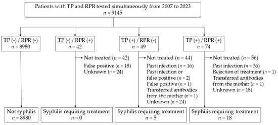 Patient selection criteria used in this study. We included 23 patients with syphilis diagnosed by physicians as requiring treatment from among 9145 patients who simultaneously underwent the treponemal antibody test and RPR. TP, treponemal antibody test; RPR, rapid plasma reagin; +, positive; -, negative.