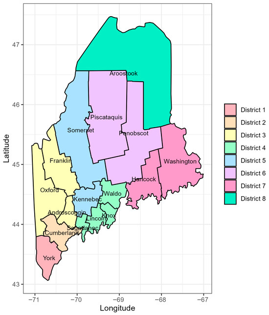 In this study, Maine’s 16 counties were grouped into eight public health districts, as defined by the Maine Legislature in collaboration with the Maine Department of Health and Human Services [11]. District 1 includes York County; District 2 includes Cumberland County; District 3 includes Androscoggin, Franklin, and Oxford counties; District 4 includes Knox, Lincoln, Sagadahoc, and Waldo counties; District 5 includes Kennebec and Somerset counties; District 6 includes Penobscot and Piscataquis counties; District 7 includes Hancock and Washington counties; and District 8 includes Aroostook County (Figure 1).